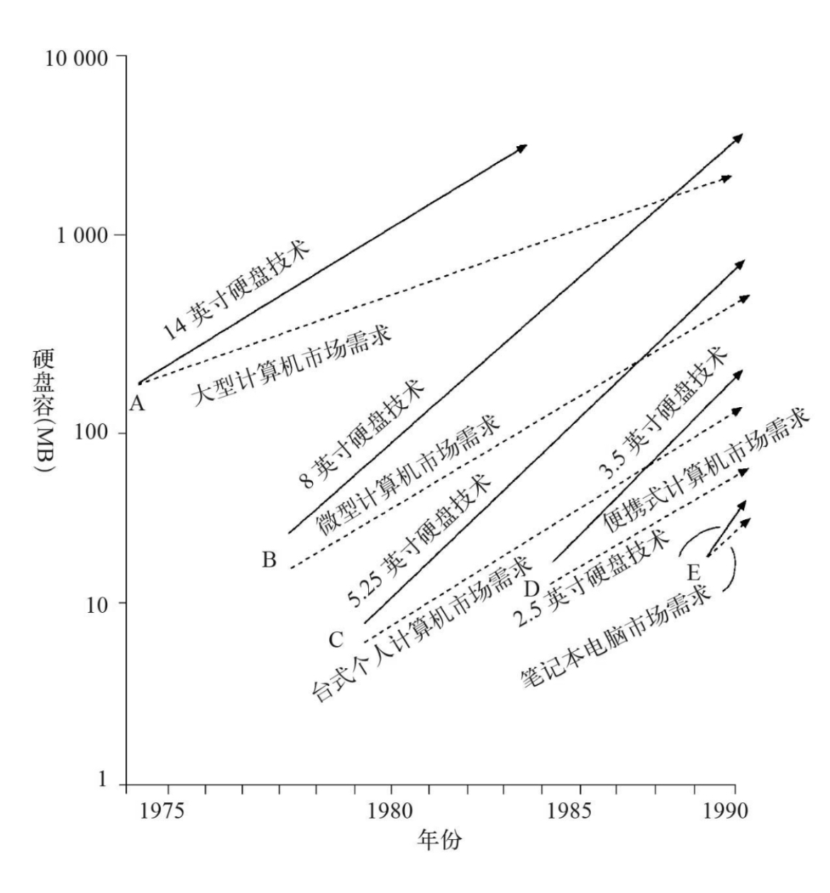 5.25英寸硬盘用户市场曾出现过两个发展高潮。第一个高潮发生在硬盘找到新的应用领域(台式计算机)之后,在此次浪潮中,诸如体积大小等在成熟应用领域相对不太重要的产品属性得到了高度重视;第二个高潮发生在5.25英寸硬盘替代成熟微型计算机和大型计算机市场上体积更大的硬盘之后,此时,经过快速增长,5.25英寸硬盘的容量增长轨线终于与这些市场所要求的容量增长轨线(增长更为缓慢)发生了交汇。