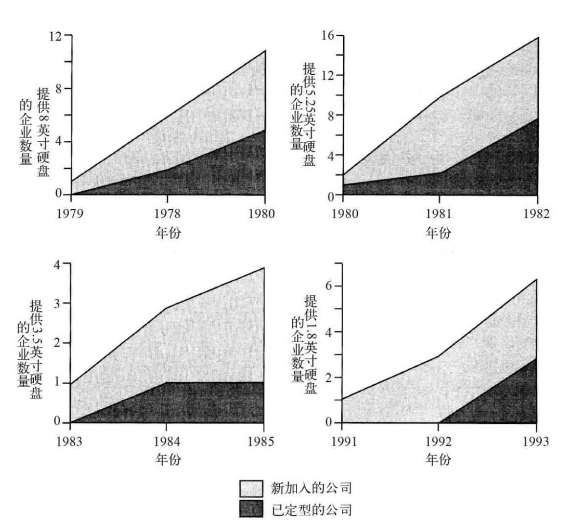 从历史上看,在延续性技术中处于领先地位并不会给领先的硬盘企业带来什么优势。与之形成鲜明对比的是,有大量证据表明引领破坏性技术非常重要。 对于那些在新一代硬盘(指具有市场破坏性的硬盘)出现后的两年内进入由它生成的新价值网络的企业来说,获得成功的概率是那些在两年后进入的企业的6倍。